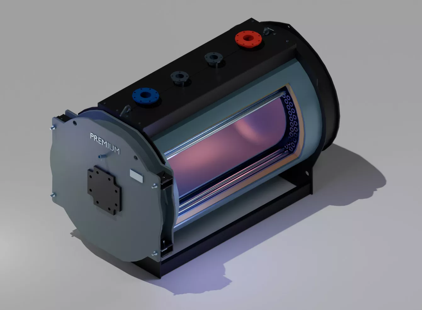 Котел стальной, отопительный водогрейный PREMIUM С предназначен для теплоснабжения зданий и сооружений, оборудованных системами водяного отопления. Выполнен в виде горизонтального цилиндра и состоит из корпуса, дверцы топки, короба дымовых газов, опоры, теплоизоляции и декоративной облицовки. В верхней части корпуса размещены штуцеры подвода и отвода воды с фланцами, а также штуцер для установки предохранительного клапана. В нижней части находится дренажная труба с трубной резьбой на конце.