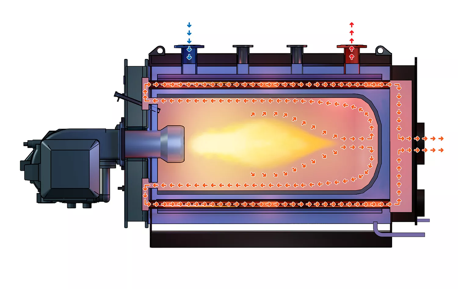 1. Корпус котла и жаровая труба выполнены из стали 09Г2С, включая дымогарные трубки второго хода, изготовленные из бесшовной котловой трубы;