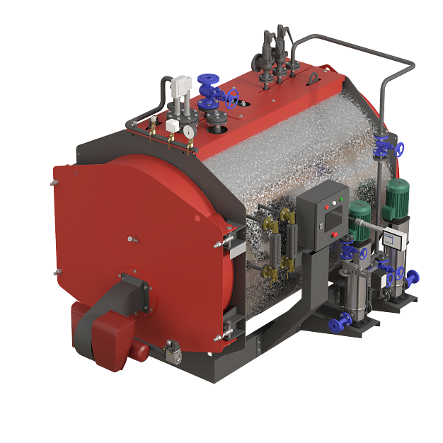 Корпус котла цилиндрической формы с плоскими трубными досками. Данная конфигурация с топкой реверсивного типа позволяет обеспечить необходимую мощность при малых габаритах котла.
