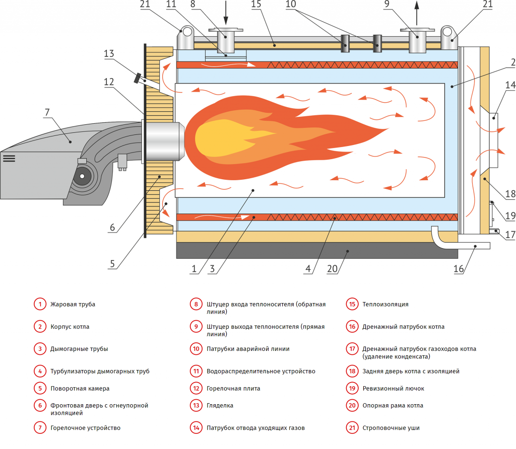 Котел относится к классу жаротрубных котлов с дымогарными трубами.
