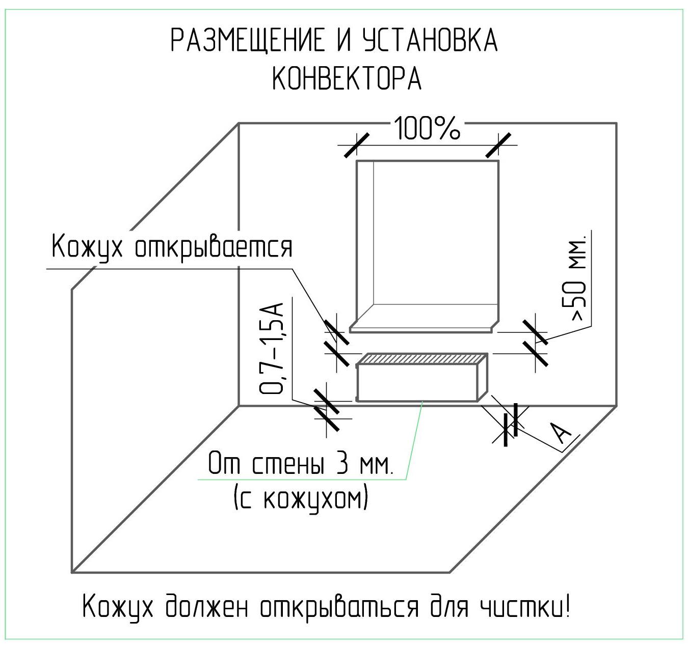 • Из гигиенических требований расстояние от кожуха конвектора до стены оставляют менее 3 миллиметров. Если конвектор без кожуха, то не менее 20 миллиметров от поверхности стены.