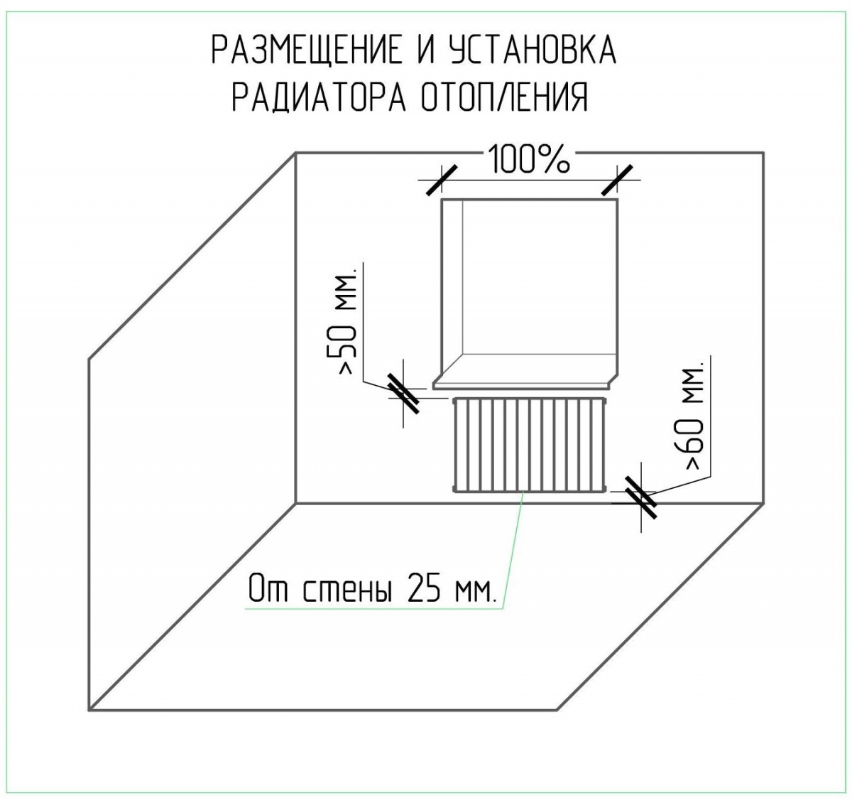 • Должна быть предусмотрена возможность легкого подключения и обслуживания радиатора. Радиаторы от стены монтируются на расстоянии не менее 25 миллиметров из соображений уменьшения теплопотерь через наружную стену и возможности удаления пыли за ним.